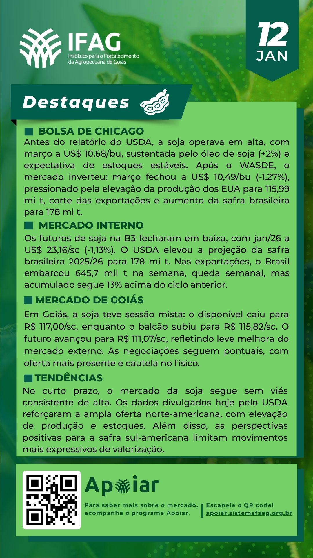 🌱 Destaques do Mercado da Soja em Goiás – 12/01/2025 | IFAG