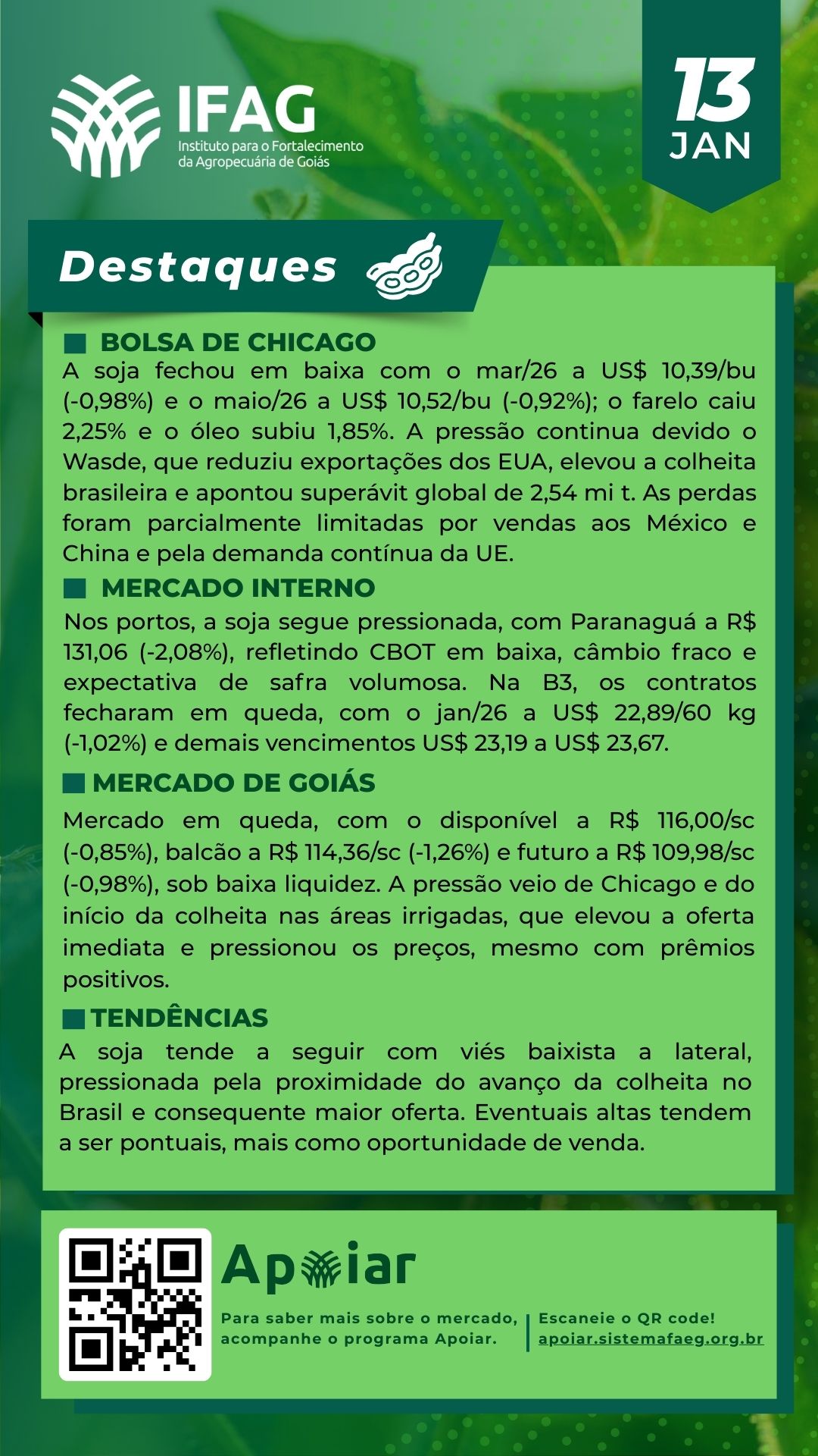 🌱 Destaques do Mercado da Soja em Goiás – 13/01/2025 | IFAG