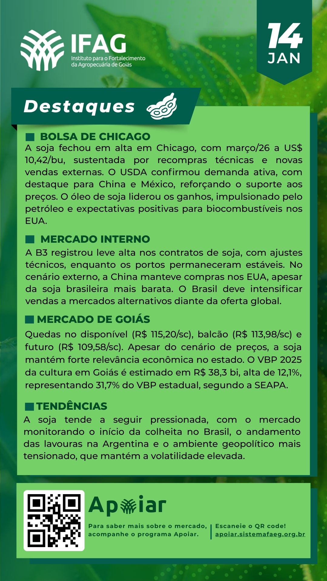 🌱 Destaques do Mercado da Soja em Goiás – 14/01/2025 | IFAG