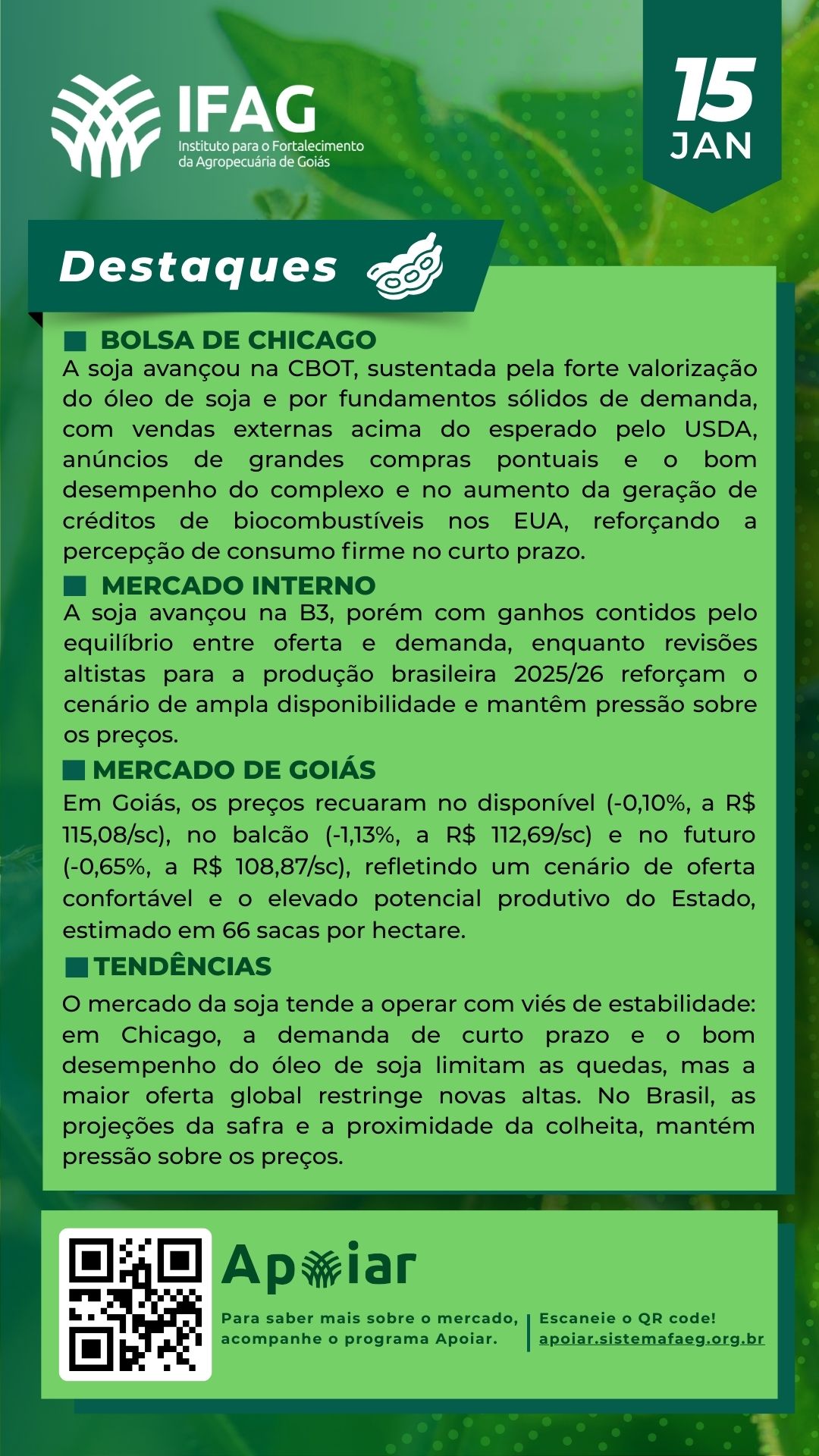 🌱 Destaques do Mercado da Soja em Goiás – 15/01/2025 | IFAG
