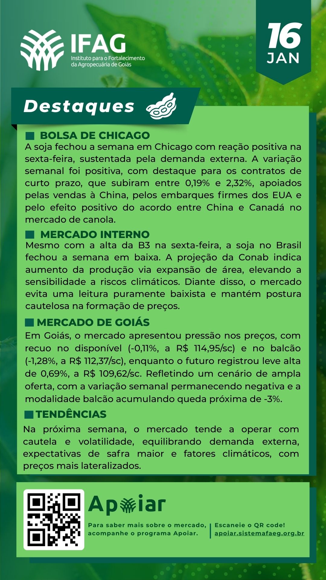 🌱 Destaques do Mercado da Soja em Goiás – 16/01/2025 | IFAG