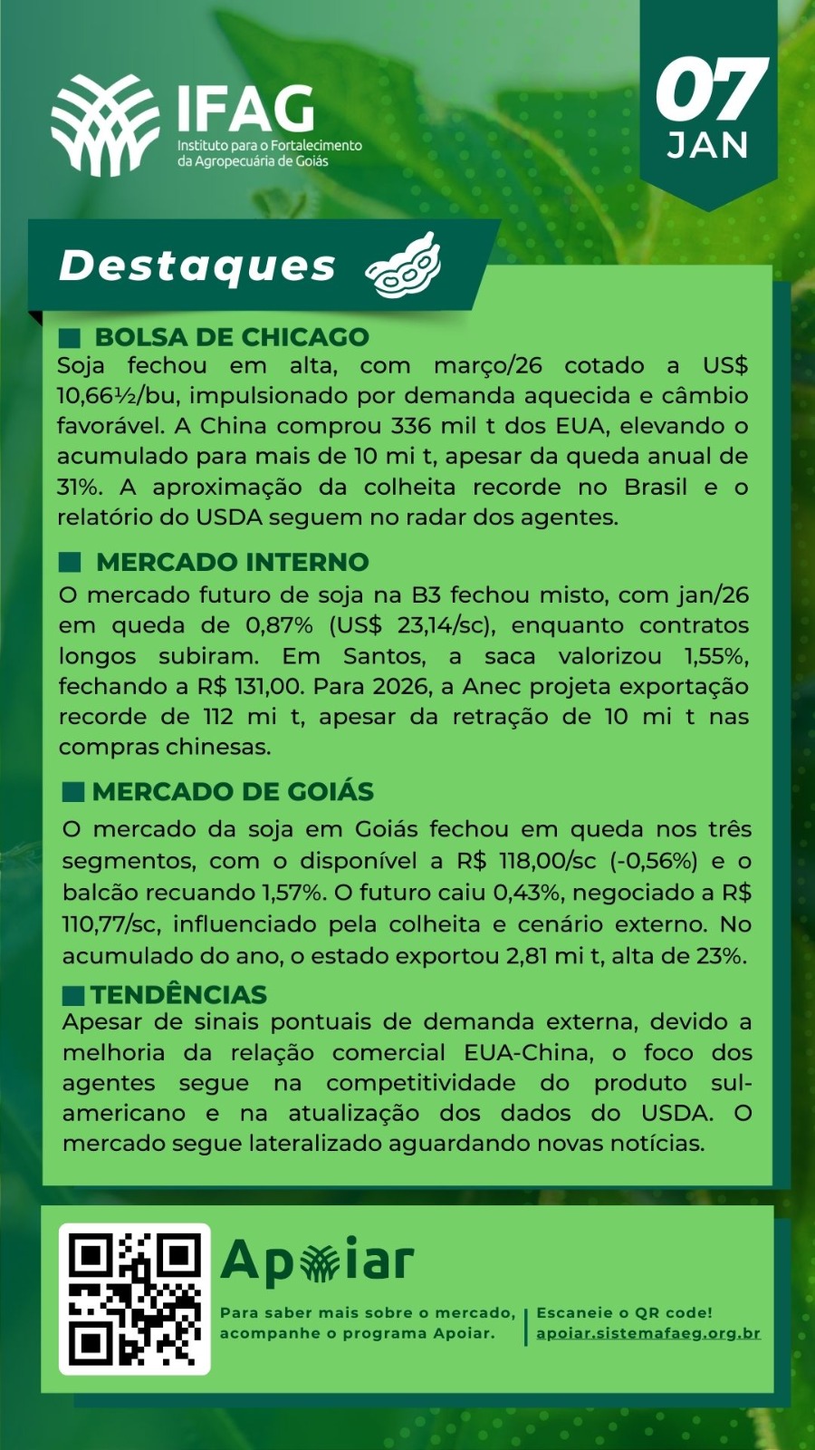 🌱 Destaques do Mercado da Soja em Goiás – 07/01/2025 | IFAG